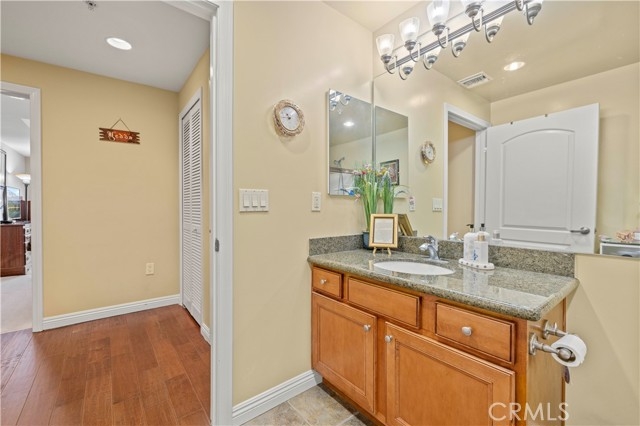 **** VA approved*** Luxury condo nestled in the heart of Reseda, a rare find in the San Fernando Valley. Built in 2007, the Corbin Villa building boasts modern amenities and distinguished curb appeal, reflecting pride of ownership. As you step inside, you're greeted by a thoughtfully designed floor plan featuring (2) spacious split bedrooms, each with its own separate bathrooms for added privacy and convenience. The large primary bedroom boasts custom carpet and ensuite private bathroom. It is complete with separate stand-up showers, tub, and dual sinks, along with a large walk-in closet providing ample storage space. The kitchen is a chef's delight, adorned with granite countertops, custom cabinetry, and stainless steel appliances including a refrigerator, range with hood, microwave, and dishwasher. Recessed LED lights with dimmers illuminate the space, creating the perfect ambiance for cooking and entertaining. Additional highlights include custom window coverings and living areas with distressed laminate hardwood flooring, offering both style and durability. For added convenience, the unit features a bonus office/utility room and indoor washer/dryer. Security is paramount with a security control panel at the entrance and a secured access entry system for peace of mind. Outside, you'll find a huge covered patio/balcony ideal for enjoying your morning coffee or it's perfect for entertaining friends and family. This secure building offers an array of amenities, including six guest parking spots, one handicap parking spot inside the garage, and two back-to-back parking spots. Residents can also enjoy the rooftop area for gatherings, security cameras, elevator access, gated garden, and more. This unit offers convenient access to schools, shopping, transportation, and dining, ensuring a lifestyle of comfort and ease.