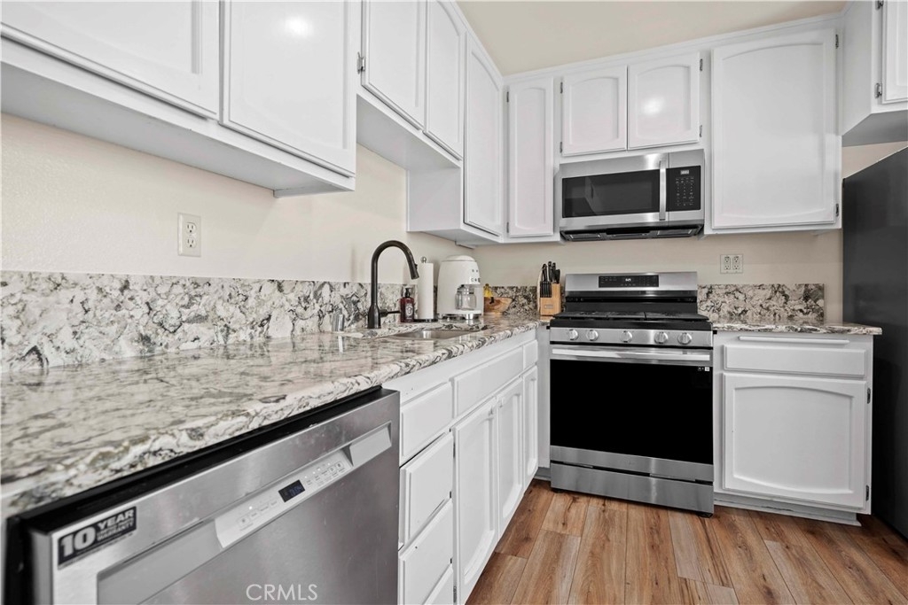$20K GRANT AVAILABLE with NO PMI. This move-in ready townhome in the exclusive Kingston Townhomes community offers 2 bedrooms PLUS DEN/OFFICE, 2.5 bathrooms, POOL, SPA/JACUZZI/HOT TUB, and beautiful grounds. The spacious interior features tall vaulted ceilings and elegant flooring throughout, with a bright and airy living room that includes a gas fireplace and opens up to a private patio. A short flight of stairs leads to a landing that can be used as a formal dining area, den, or play room, leading into the chef's kitchen. This gourmet kitchen's got it all: NEW stainless steel refrigerator and ALL NEWER APPLIANCES less than 5 years old including dishwasher, solid wood cabinets, granite countertops and ample storage. There is plenty of room to cook and have a comfortable space for family and friends to enjoy meals together over a six-person dining table. Take another short flight of stairs to the bonus den which can be used as an office or home gym. Take another short flight of steps to the level with both bedrooms. A stately primary bedroom has dual walk-in closets, vaulted ceilings, and an ensuite bathroom while the second bedroom offers natural light, crown molding, and generous closet space. A private attached 2-car garage includes a new washer/dryer and lots of room for storage. Enjoy security and low maintenance in the exceptionally well maintained gated community with a sparkling pool and spa that will make you feel you are on vacation at your own home! The HOA includes water, trash, earthquake insurance, landscaping and guest parking. Located in the San Fernando Valley – you've got parks, malls, educational institutions (CSUN), coffee, groceries, Costco, all nearby. Major freeways, including the 101 freeway are nearby, providing a gateway to Los Angeles downtown and LA’s beaches and mountains. Don’t miss out on this incredible turnkey home with fantastic amenities! HOA INCLUDES WATER and EQ Insurance!