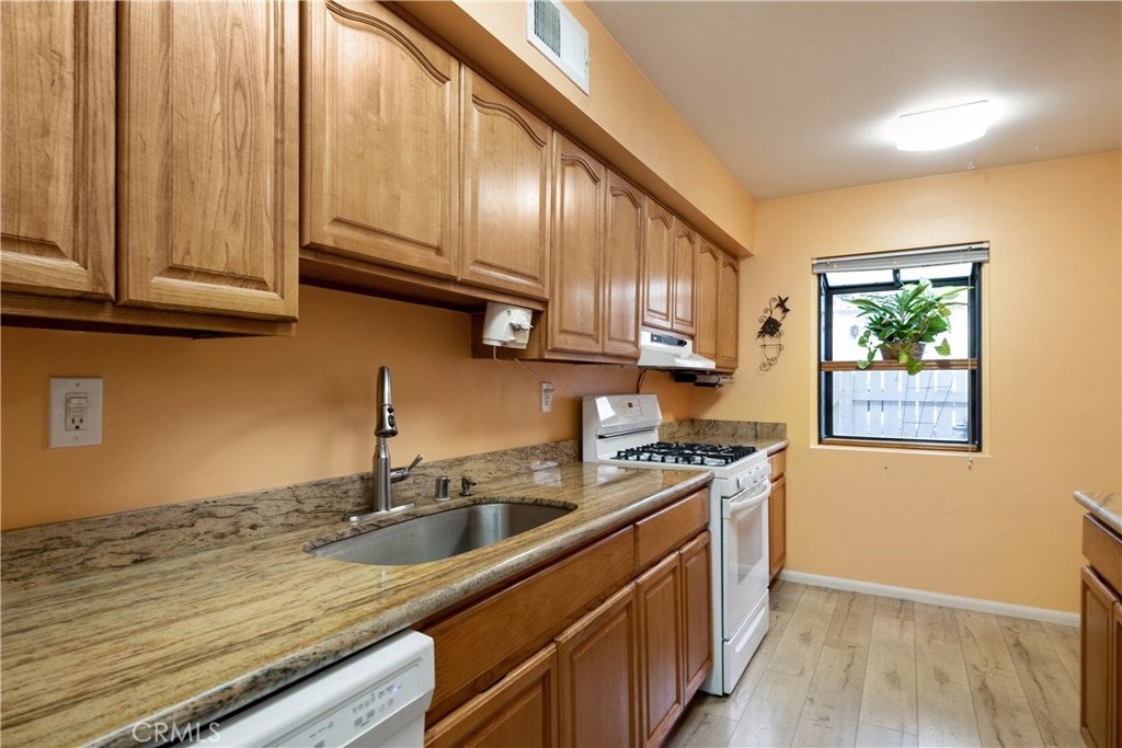 Welcome to your oasis in Reseda: Northridge Village. Opportunity knocks in the gated, tree-lined community which features park-like setting with two pools, in-ground spa, banquet facilities and play structure. Waiting for you is the spacious townhome surrounded by greenery on the pleasant walkway to your front door. You’re greeted by the over-sized patio with mature, fruit-producing lemon tree. Upon entering the home, you’ll find newer laminate floor throughout the large living room with sliding door to patio, dining room and kitchen. Generous cabinet space and long granite counters with room for a table to grab a quick bite make for a pleasant kitchen to create your family meals. Completing the first floor is the guest half bath, storage under the stairs and direct access to your two car garage with workshop and laundry. Step upstairs to find all three bedrooms on the same level. The spacious main bedroom with en-suite bathroom and over-sized vanity features his and her closets and private balcony for relaxing among the trees. Don’t miss the pull down door in the closet to access the storage space in the attic. The two good-sized bedrooms and full bath are just down the hall…great for families or for working from home!