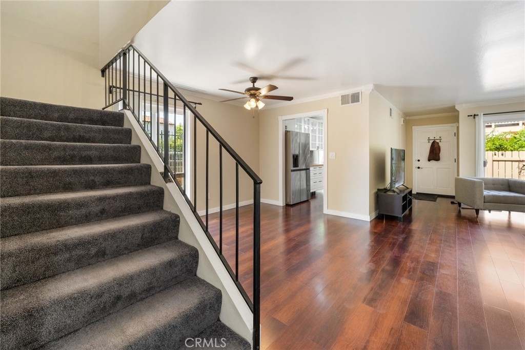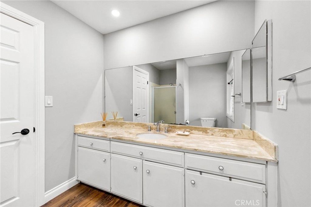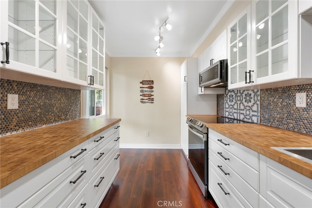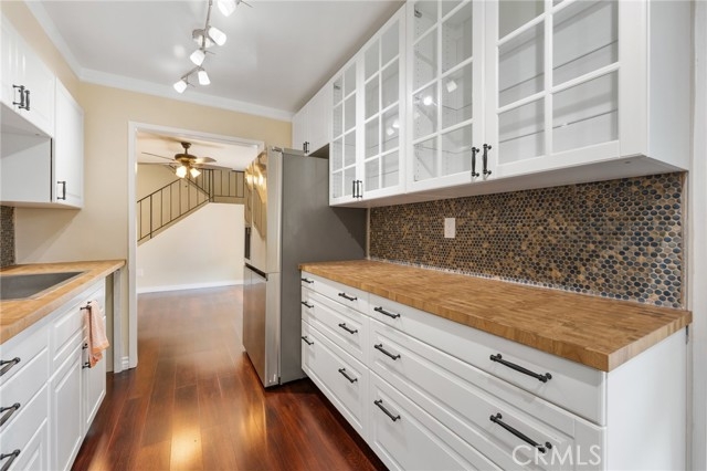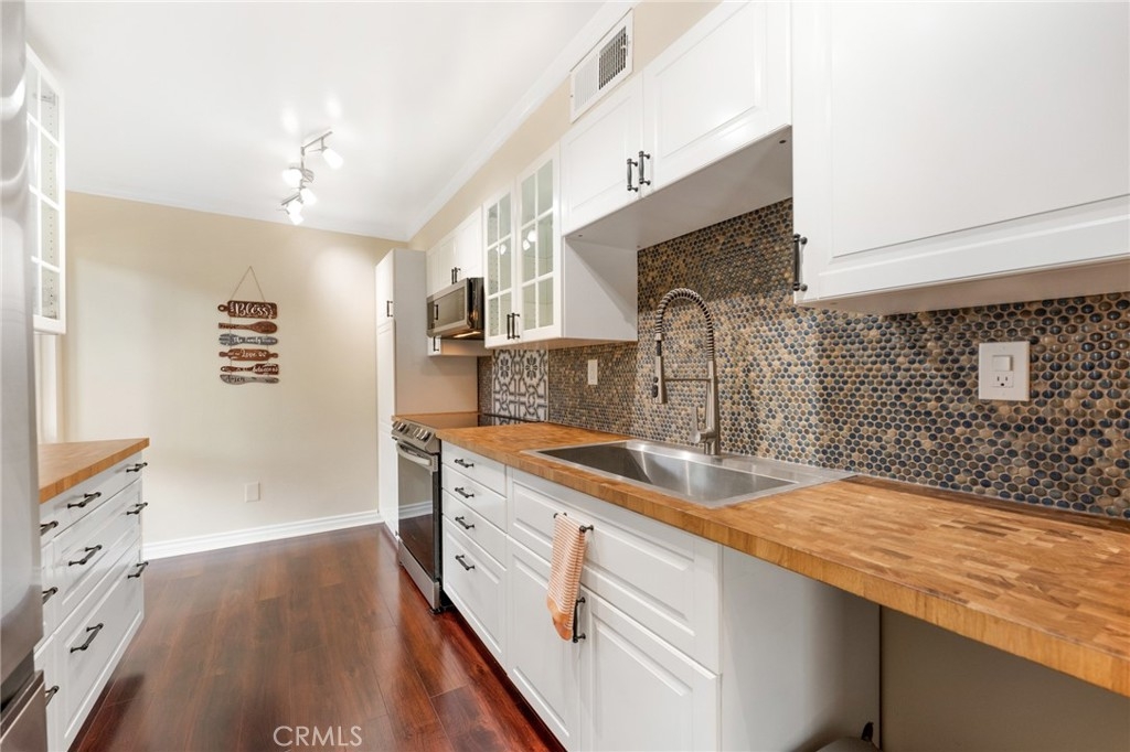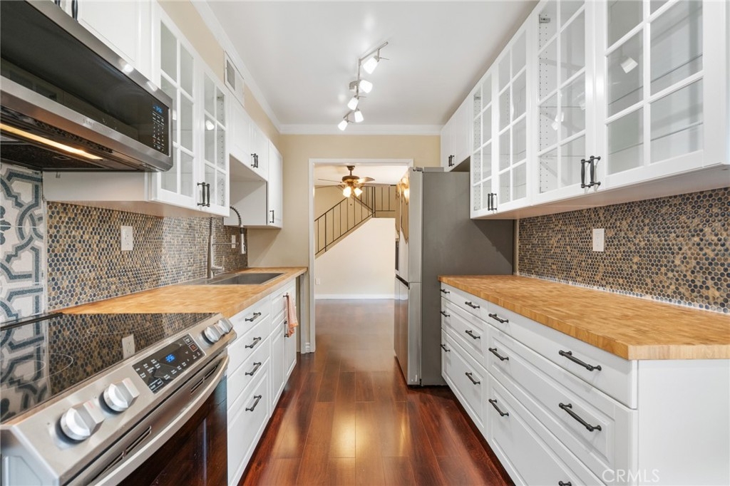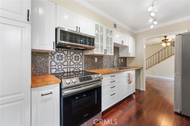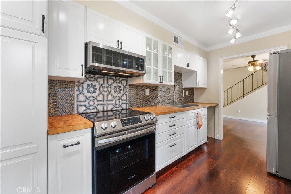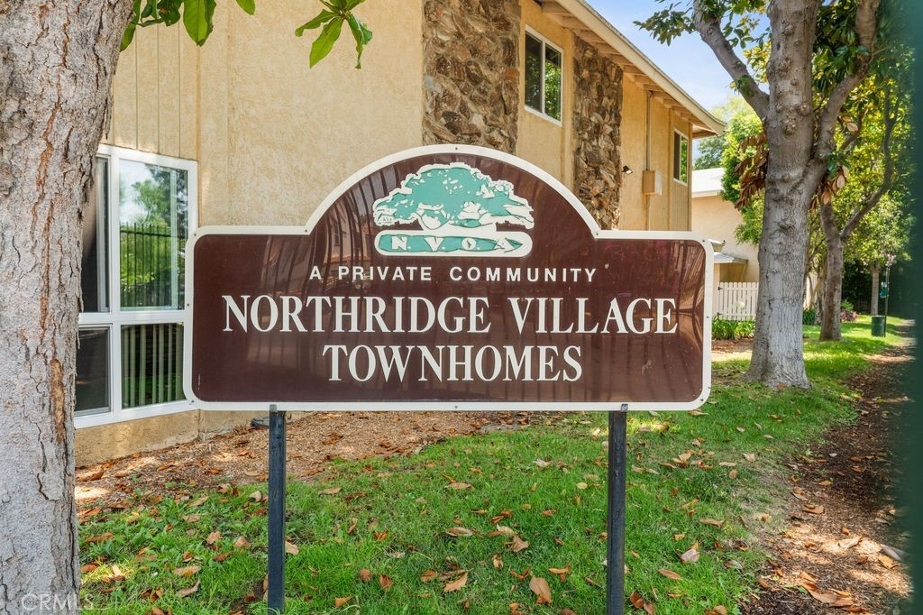 Welcome to this rarely available corner unit townhome in the highly desirable Northridge Village community! Just 2 miles from Cal State Northridge and walking distance to Northridge Hospital, this beautifully maintained 4 bedroom, 2.5 bath home is move in ready and offers comfort, privacy, and an unbeatable location. Located in a gated, park like community with mature trees and lush greenbelts, this corner unit boasts no neighbors on three sides, giving you an extra sense of peace and space. Step through the private, oversized front patio ideal for BBQs, entertaining, or relaxing under the sun and into a spacious living room featuring a brick fireplace and sliding doors that open back to your patio. The separate dining area flows into a recently remodeled galley kitchen, complete with white soft close cabinets, a farm style sink, butcher block countertops, pull out pantry shelves, stylish backsplash, and stainless steel appliances. A sunny breakfast nook with a large window creates the perfect spot to enjoy your morning coffee. A powder room and a large storage closet under the stairs complete the first floor. Upstairs, you'll find four generously sized bedrooms, including a spacious primary suite with his and hers closets, a vanity/office/craft nook, and private balcony access to enjoy fresh air. The ensuite bathroom includes a large window that fills the space with natural light. The three remaining bedrooms share a full hallway bath with tub. Additional highlights include: Direct access 2 car garage with fresh paint and storage space, Central HVAC, Newer dual pane windows, Laminate hardwood flooring throughout the first floor and Ceiling fans and updated interior doors. Community amenities feature three pools, a clubhouse, playground, plenty of guest parking, security patrol, and beautifully maintained grounds. This home offers the perfect blend of style, space, and convenience a true gem in the heart of Northridge. Don’t miss your chance to call it yours!