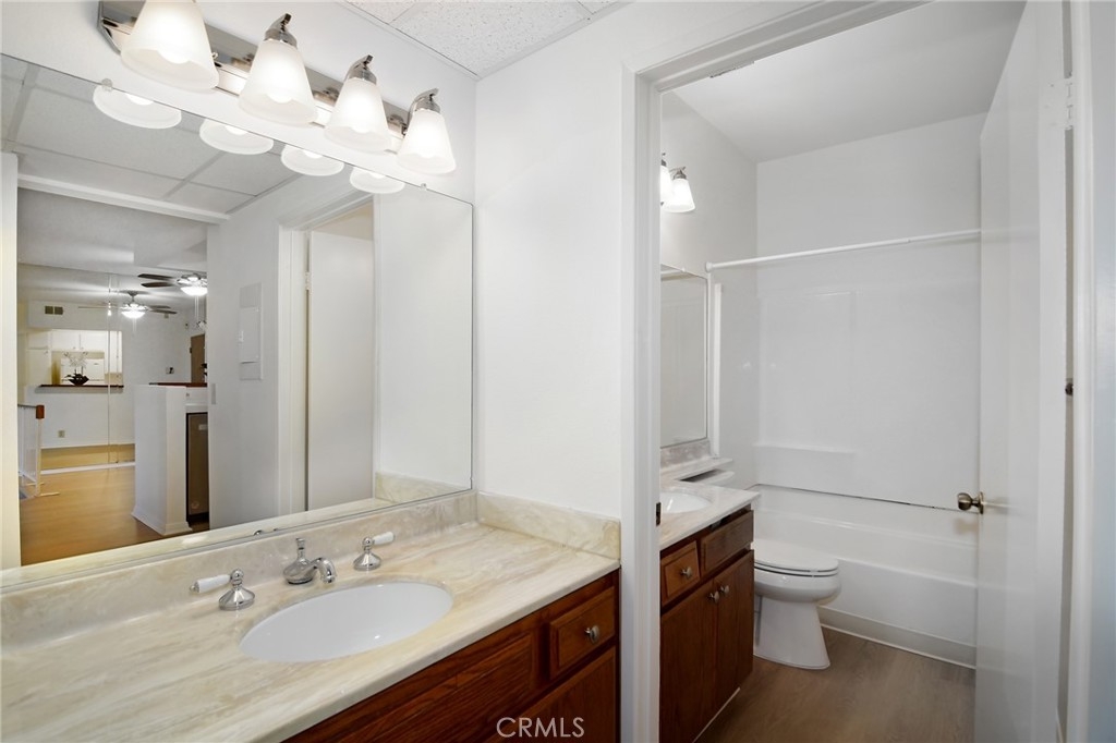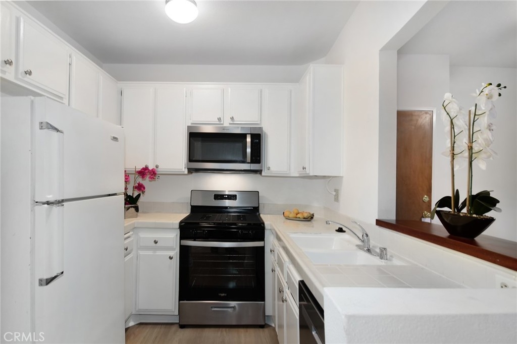 Oversized one bedroom condo in a sought-after Park Avenue East Condominiums community, secured and meticulously maintained complex in the West Valley with pool, Spa and gym/ex room. Away from the street noise, this charming unit has a very functional layout - good size living room with a nice fireplace and a little balcony overlooking a court yard, well appointed dining area, fully equipped kitchen with new stainless steel appliances and ample counter space, good size bedroom with a walk-in closet, full bathroom and an additional sink in the hallway. Freshly painted and with new vinyl luxury plank floors throughout, this unit looks extremely appealing. Inside laundry, newer A/C unit, 2 parking spots and a private storage shed in the community garage are an additional bonus. Nice area, close to shopping, entertainment and fine dining, short drive to The Village and Topanga mall, easy access to 101 freeway. Not many units become available in this community.
