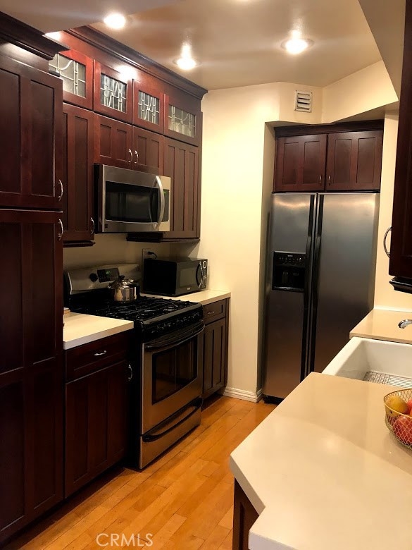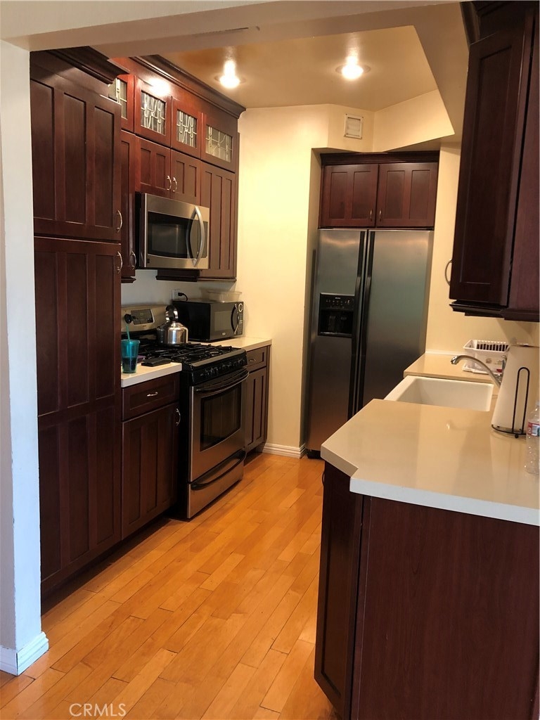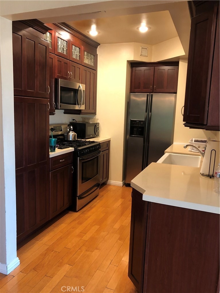 This beautiful condo is well situated and maintained. Close to shopping and dining in the Valley. End unit located on First floor. Custom kitchen cabinets, stone counter tops, hardwood & tile floors. Master Bedroom with walk-in closet! Other amenities include; fireplace, in-unit laundry, balcony and a community recreation/meeting room. Gym, swimming pool and spa. Gated parking for 2 vehicles, and a storage area. A must see!!!