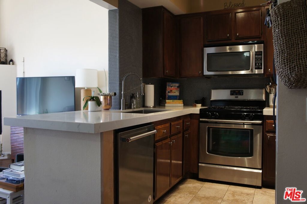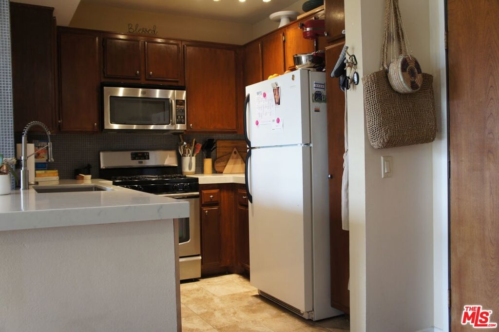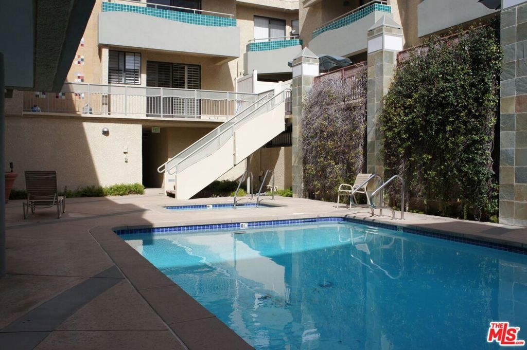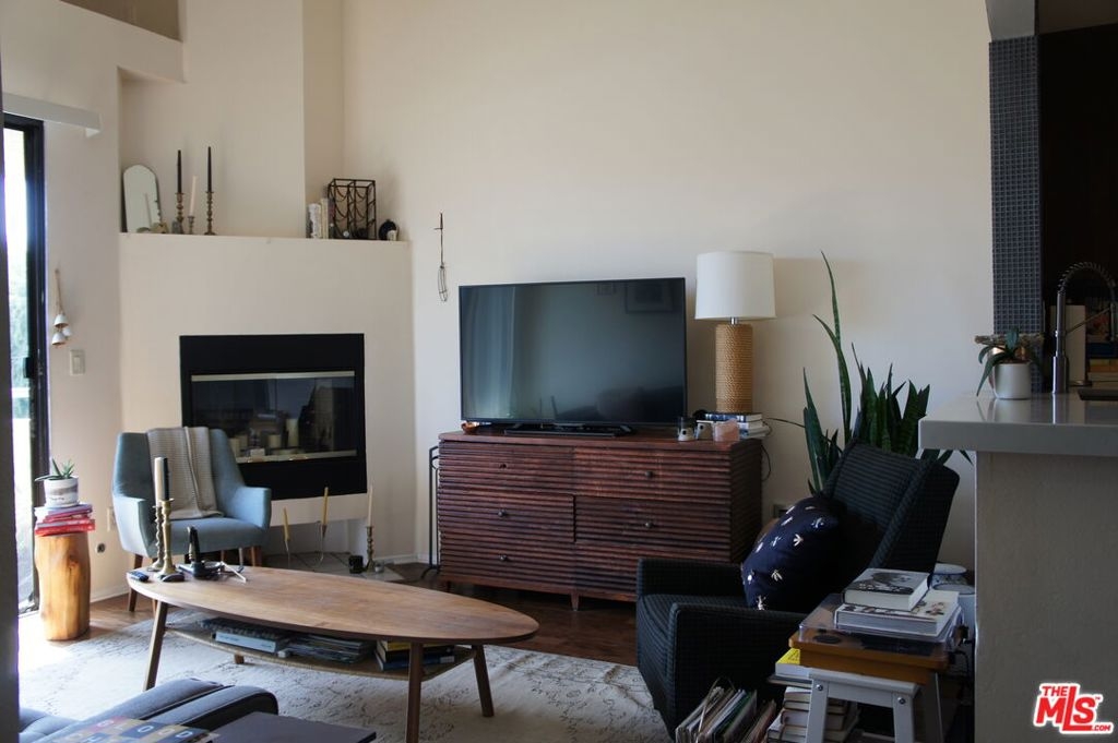 Bright and airy open concept condo in a well managed building. High vaulted ceiling in the living room, southern exposure for maximum sinlight. Spacious master suite and a good size guest bedroom, 2 full bathrooms, washer/dryer hookups. Hardwood floors throughout, updated kitchen counters, gas fireplace in the living room. New AC unit installed last year. Courtyard pool and spa, well stocked excersise room. Secure garage with 2 tandem parking spots and a storage locker. Excellent location! Easy access to the 101 freeway and all major roads.