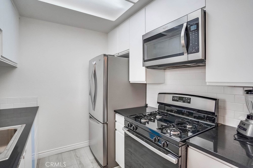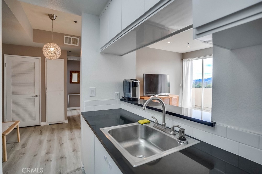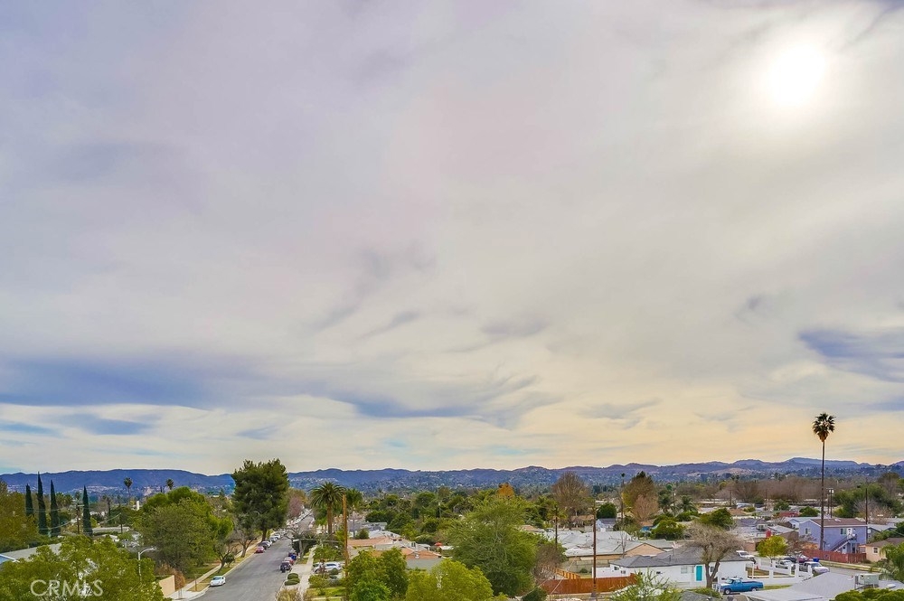 MILLION DOLLAR spectacular view of the Valley and Santa Monica Mountains 1 bed/1 bath top and corner unit provides privacy from the neighbors. Remodeled open floor plan bright and cozy unit with all of natural light. Living room and bedroom have a sliding doors leading to a long private balcony. Fire place in the living room. The kitchen has new cabinets, granite counters, dishwasher, built in microwave and brand new gas range, refrigerator included. Bedroom has organized walk-in closet. Stacked washer and dryer are included. Central AC with Nest smart thermostat. Secure entry and assigned tandem parking spaces for 2 cars, guest parking and a big walk-in extra storage in the garage. Resort-like well-maintained complex with a community pool and spa, sauna, gym, recreation room. Complex has new roof and fire alarm (2019), and new solar boiler (2018). Night Security Guard and lots of cameras in the building. Immaculate, safe gated place close to Warner Center, The Village, public transportation, Shops, Restaurants and Entertainment. YOU MUST SEE TO APPRECIATE EVEN IF YOU HAVE SEEN OTHER UNITS IN THE BUILDING BEFORE.