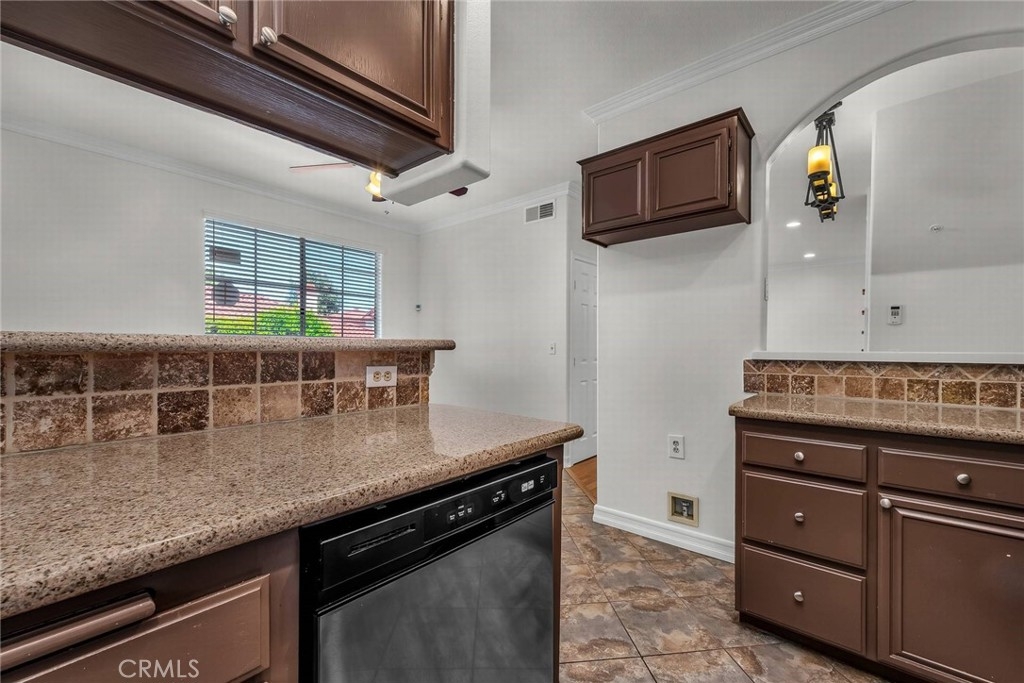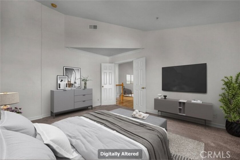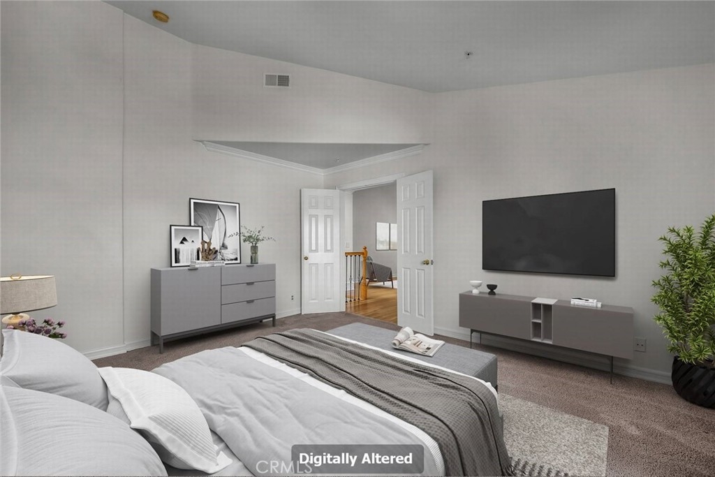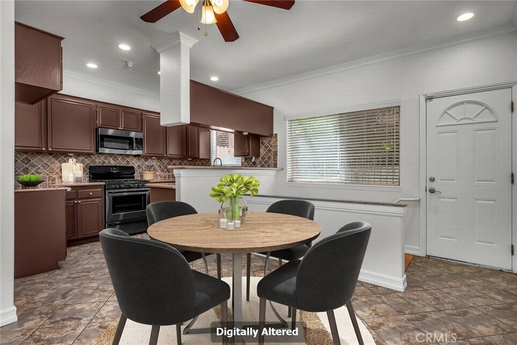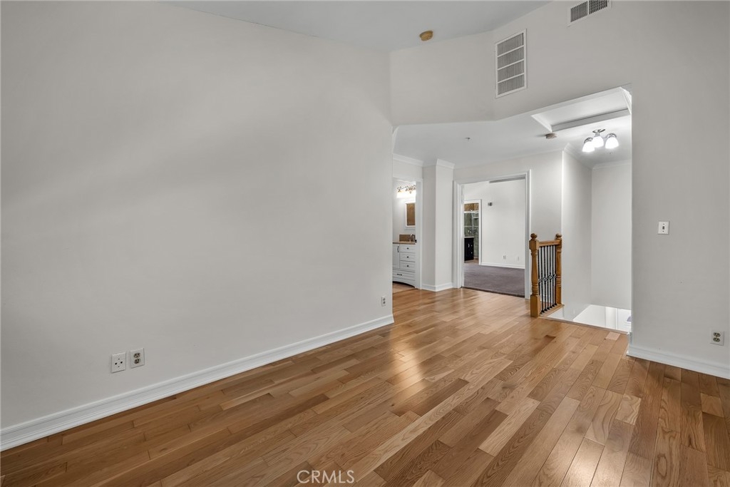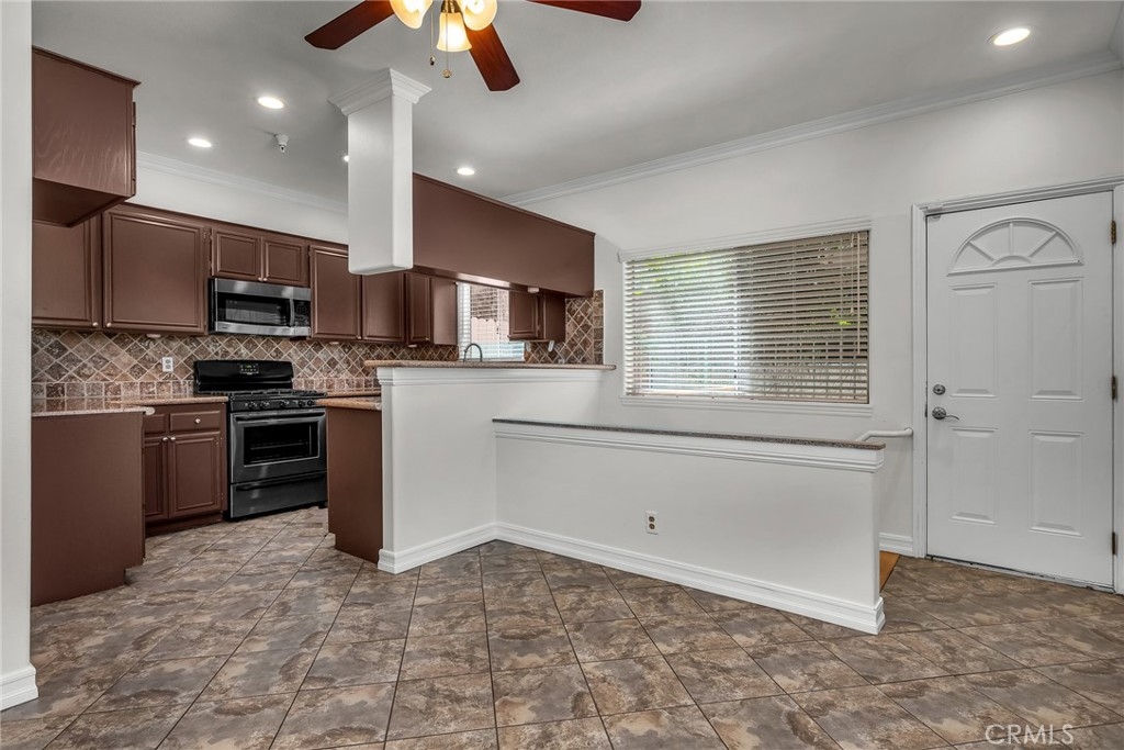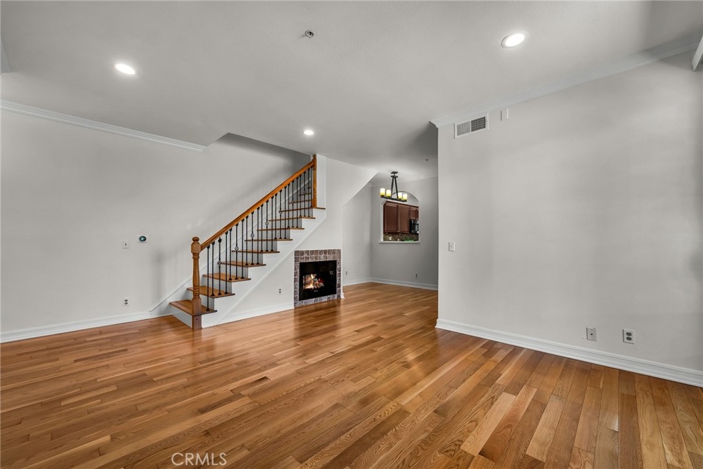 Stop the search—this is the townhome you’ve been waiting for. Beautifully upgraded tri-level residence, quietly tucked at the back of the complex, blending comfort, style, and everyday convenience. Designed for modern living and effortless entertaining, this light-filled home features soaring ceilings, abundant natural light, and an open, airy layout throughout. The main level welcomes you with a spacious living room highlighted by high ceilings, crown molding, recessed lighting, wood-style flooring, and a cozy fireplace. A sliding glass door opens to a large private balcony—perfect for morning coffee or evening relaxation. A convenient guest bathroom completes this level. The updated kitchen showcases warm Carmel-toned cabinetry, granite countertops, stone backsplash, stainless steel appliances, and decorative tile flooring, all opening seamlessly to a generous breakfast area ideal for casual dining. Upstairs, a decorative staircase leads to a versatile bonus area—perfect as a family room, home office, or media space. The expansive primary suite offers a peaceful retreat with a walk-in closet and an updated ensuite bathroom featuring a granite-top vanity and beautifully tiled step-in shower. The spacious secondary bedroom includes a mirrored closet and access to an updated hall bathroom with granite-top vanity and tub/shower combo. Both bedrooms enjoy direct access to a large, tranquil balcony, enhancing the indoor-outdoor flow. Additional highlights include a private two-car garage with washer and dryer, ample storage, and a well-maintained community featuring a pool, spa, and recreation room. Ideally located near shopping, dining, and with easy access to the 101 and 405 freeways, this home offers the perfect balance of comfort, convenience, and lifestyle.
