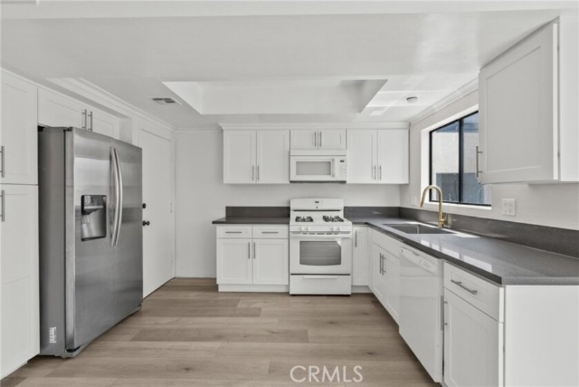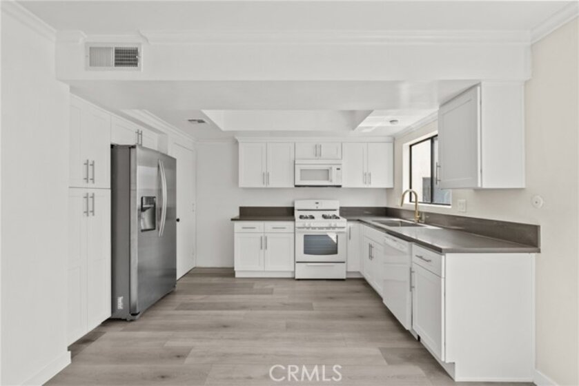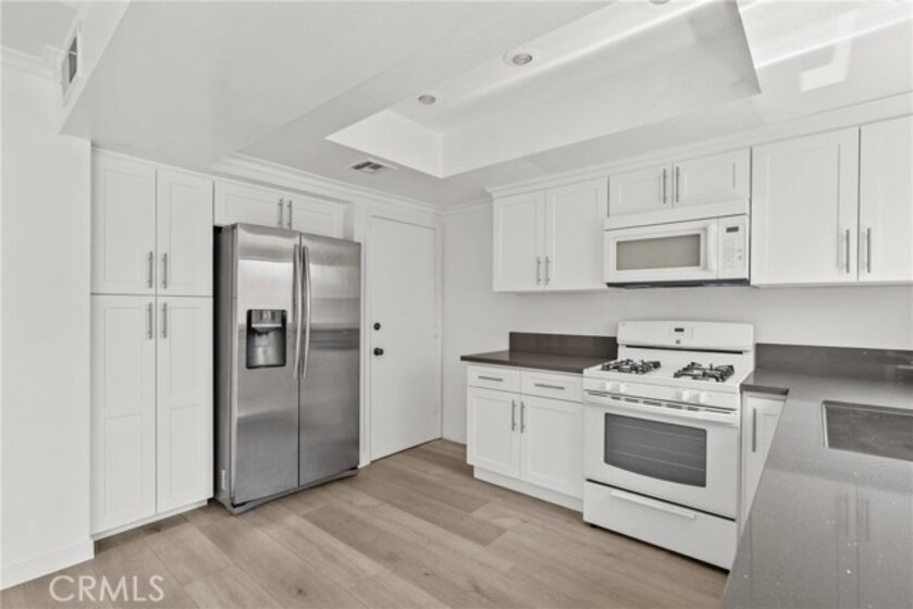 Stylish Updated 2 BR/ 2.5 BA Townhouse with approx. 1,095 sq.ft of living space. Privately tucked into a secure, gated complex in the heart of Reseda, this tri-level home features a remodeled kitchen with quartz counters and sleek cabinetry, laminated wood floors throughout, and a cozy fireplace in the living area. Master suite with private bathroom and high vaulted ceilings. Updated Bathrooms, Central A/C & heat. The attached 2-car garage provides secure parking and laundry area.