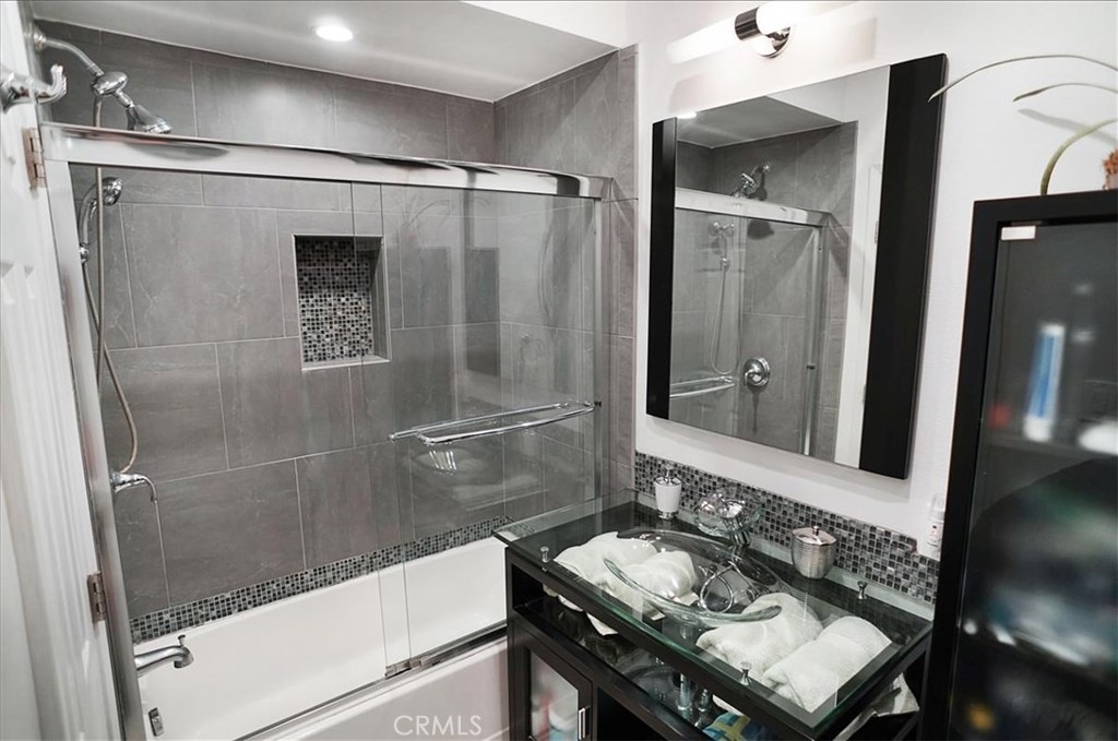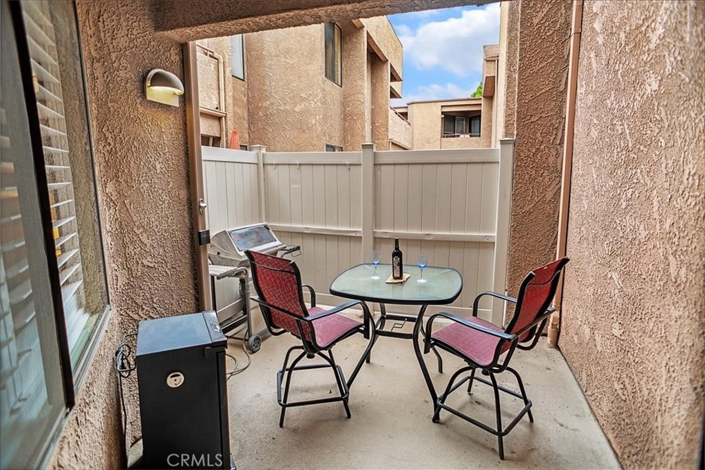 Beautifully appointed one bedroom one bath home with newer upgrades. Turn Key and enjoy this spacious floor plan with Pergo flooring in living room and step up dining area and kitchen.Living room is accented with a fireplace and wood mantel. Newer LED recessed lighting. Newer light fixtures in dining room and entryway. Plantation wood shutters in living room and master bedroom. Master Bedroom has upgraded bamboo wood flooring and ceiling fan and mirrored wardrobe doors. Upgraded full bathroom with porcelain tile backsplash and waterfall faucet and glass counter top. Shower tub has gray stone with accented porcelain inset for shower accessories. Indoor Laundry area in unit. Entertainers private patio with hookup for gas BBQ grill. Two tandem parking spaces and a storage shed in garage. Located in an active HOA featuring pool, spa and gym. Many nice features for you to enjoy.