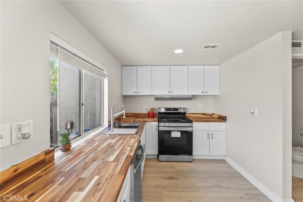 This is a Completely REMODELED Two-Bedroom TOWNHOME in Reseda! This charming home is an END UNIT with only one shared wall. All flooring is Brand New beautiful Laminate Wood, Ceilings are all Smooth with new Recessed Lighting. Kitchen is Completely Remodeled with Copper Plumbing, all new SS Appliances, new White Shaker-style Cabinets, oiled solid wood Butcher Block Counter Tops, and SS Sink with Cook’s Faucet. There is a Coat Closet under the Stairs. Bathrooms have brand new Vanities, Toilets, Mirrors, Medicine Cabinets, Lighting, Fans, and Flooring. The remodel was complete Jan 20, 2023 so it’s a BRAND NEW home inside! The home has a spacious Backyard PATIO with plenty of room for BBQ, Outdoor Entertainment, and even a Grassy Area for the puppy! Inside the Private Backyard is a large, private, locking SHED, excellent for Storing lots of life’s necessitates. The Backyard has New Fencing and the Locking Gate leads directly and conveniently out to the Two-Car-Port Spaces. The complex is safely located near the West Valley LAPD Station and across from the Randal Simmons Park for family and doggie fun! The Library is around the corner, and it’s close to public transportation, dining, shopping, medical and more!