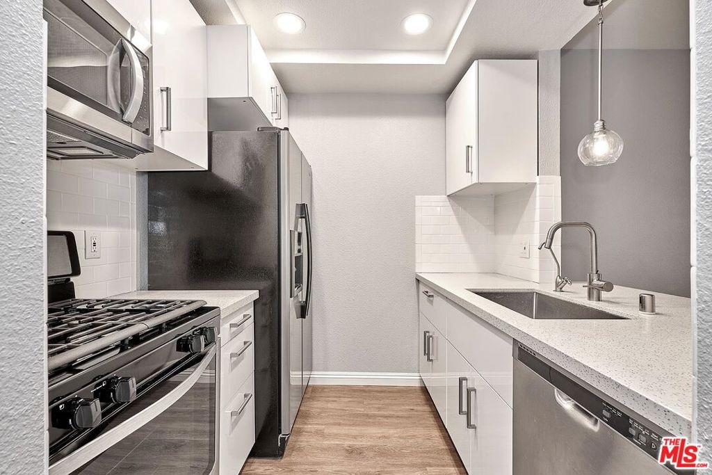 Fully upgraded and completely remodeled 2 bedrooms & 2 bathrooms unit on convenient Sherman Way. Courtyard view from your 9 feet high-ceiling living room and balcony. The corner unit has only one wall attached. This beautiful condominium is amazingly upgraded with recessed lights, hardwood floor, custom paint, quartz countertops, stainless steel appliances, high-quality cabinets, and tiles backsplash. Open kitchen with breakfast bar. Extra storage unit included in the parking garage. Two assigned tandem parking spaces. Double gated parking garage that is remote control activated for extra security. Washer and dry are NOT included in sale.