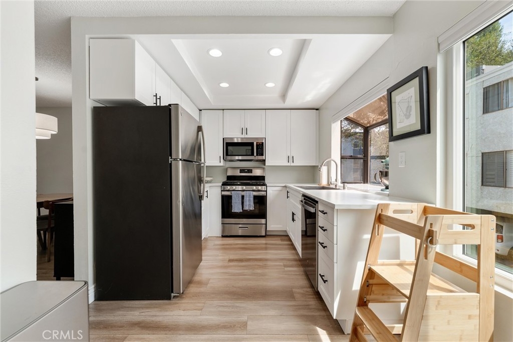 Your Reseda Oasis Awaits! Welcome to this spacious, two-bedroom, two-bathroom unit, offering over 1,000 square feet of comfortable living space in the desirable Country Walk community in Reseda. This unit is not on the main street, providing a quiet, peaceful living environment. Step inside to a home filled with natural light, featuring high ceilings, a spacious living room with a cozy fireplace and a skylight. The freshly painted interior and new flooring create a bright and inviting atmosphere. The newly remodeled bathroom offers modern appeal. The updated kitchen is a cook's delight, with modern stainless steel appliances and lots of counter space. The home offers a great floor plan with good-sized bedrooms and a walk-in closet in the primary bedroom. You'll love the beautiful landscaping and a large front patio that's perfect for relaxing or entertaining. A unique feature is the direct access from the unit to the one-car garage, with an additional assigned parking space right next to it. As a resident, you'll also have access to the community pool, perfect for relaxing on a hot day. *****Seller will consider all offers, including those offers that include Concessions*****