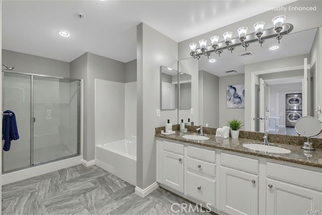 Built in 2007, the Corbin Villa building boasts modern life style reflecting pride of ownership. This top floor unit offers both privacy and sophistication soaring vaulted ceiling which fills the home with natural light. The upgraded kitchen showcases a modern stainless apron-front sink, coordinating appliances, and ample counter space. Contemporary laminate flooring, smooth ceilings, recessed lighting give the home a clean, modern feel.The primary suite offers a true sense of retreat, featuring a generous closet space and a spa-inspired en-suite with dual vanities, a separate soaking tub, and a stand alone shower. Additional storage can be found throughout the unit, along with an in-unit washer/dryer for added convenience.Two assigned spaces in a secured underground garage and six guest parking spots make parking effortless. Ideally located for quick access to all parts of the Valley, this penthouse condo combines comfort, style, and practicality—perfect as your next home or an exceptional investment opportunity.