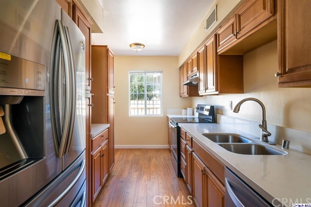 Beautiful, remodeled townhouse in the heart of Reseda. This gorgeous turn-key townhouse offers three bedrooms and two and a half bathrooms and is situated in a gorgeous resort style gated community with three pools, spa, kid's playground and a clubhouse. The home is open and bright with new flooring, recessed lighting, and paint throughout. The living room is spacious with a gorgeous brick fireplace and crown molding. Kitchen featuring new flooring, quartz counter tops and brand new appliances. Elegant formal dining area. Downstairs powder room for guests. Upstairs resides three bedrooms including an oversized master en-suite with walk in closet and second bathroom. Newer HVAC system and two-car attached garage with new garage door and full size laundry hook ups. Amazing and private outdoor patio. Space, charm, location, price. This home has it all. Don't miss it.